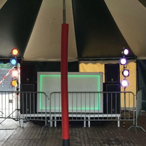 Band podium met de hele dag lokaal geweld, en klein DJ podium voor het aan stormend DJ talent.