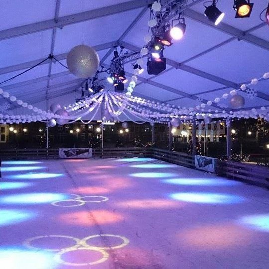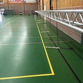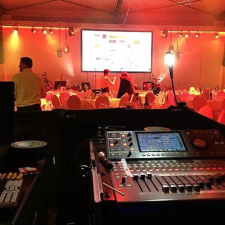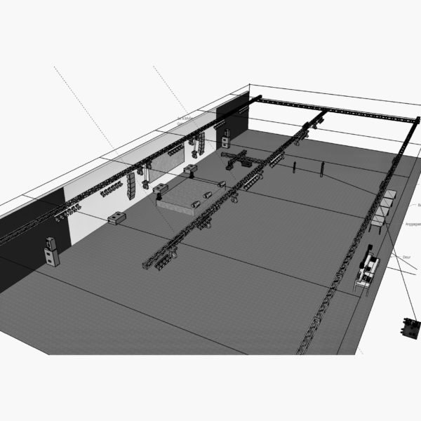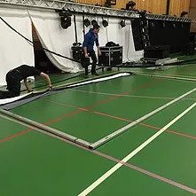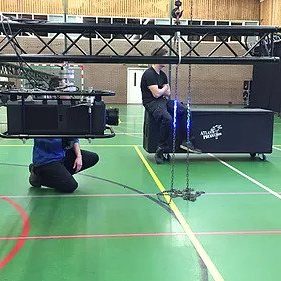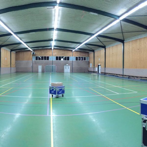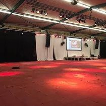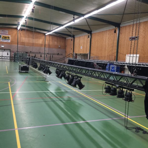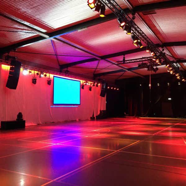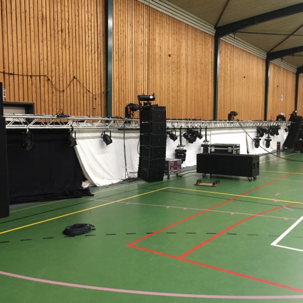 Sporthal compleet afgehangen met theaterdoek en vol gehangen met licht en geluid.